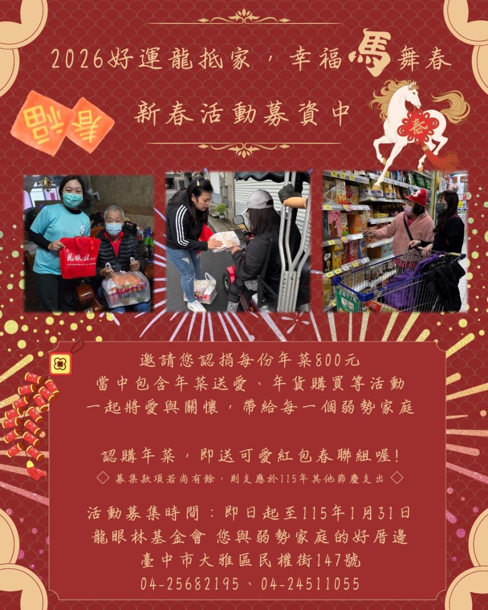 臨近歲末,又到了每年喜迎新年的時節,邀請你、我、他,大家一起來溫暖每一個黑暗的角落,讓弱勢家庭都能共度充滿盼望的好年,期盼好運【龍】可以傳遞到每一個弱勢家庭中,無比的幸福【馬】攏舞春!
